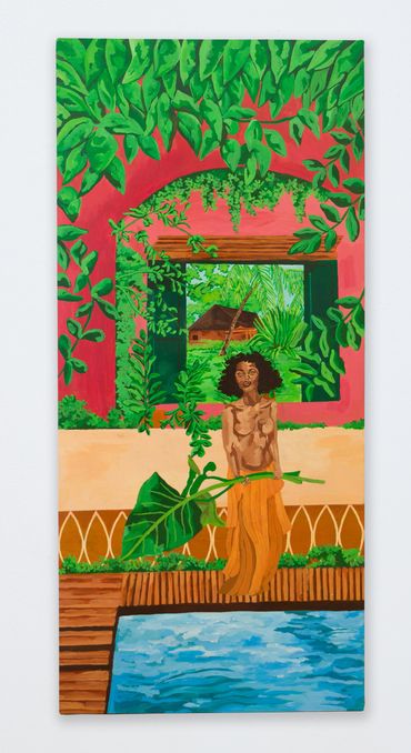 In her paintings, Johnson crafts a world where reality intertwines with dreams, often embracing the tactile embrace of hand batiked textiles. Exaggerated figures, reminiscent of fashion illustrations, gracefully inhabit lush, encompassing natural landscapes. Here, the whimsical meets the profound as geometric patterns and surreal organic environments meld in harmonious dialogue.