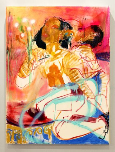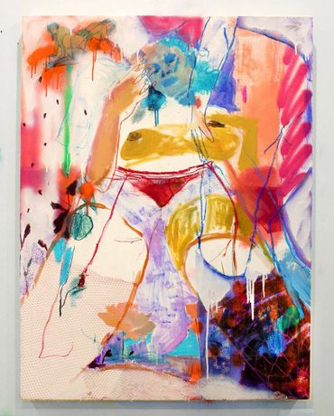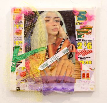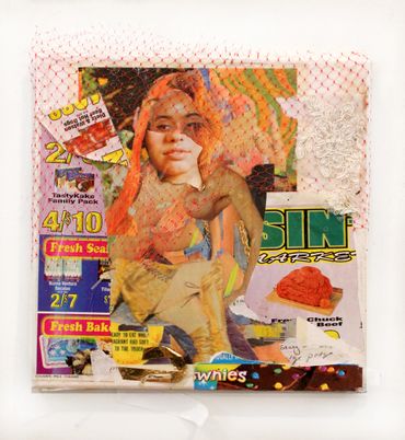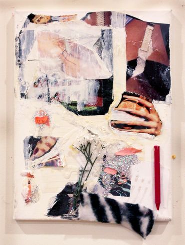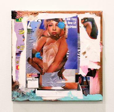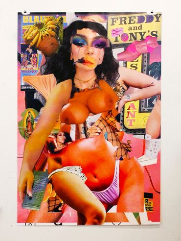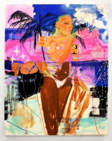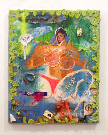 The elegance with which Chloe Luisa Piñero treats her painting materials allows us to comfortably approach her maximal, sometimes hypersexual imagery. Assortments of found-objects intertwined with intricate painterly compositions amount to a diverse visual experience in a range of formats including conventional painting, mixed-media assemblage, and digital collage prints. The objects and images themselves arrive from an equally broad assortment of sources including dollar-store knick-knacks and discount beauty store products interspliced with retro, pornographic cutouts and scenes borrowed from travel-agency promotions. Chloe seamlessly blends nostalgic material with images taken from present day digital spaces, including beauty and fashion advertisements from Instagram-explore pages and google images of objects and places from her personal history.