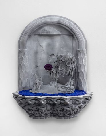 Many of Goffman’s aesthetic allusions reference both the piquant visual appeal of popular Anime and Fantasy culture and the very real violence associated with reimagining historical boundaries. The foundation of the architecture of this imaginary state house was inspired by photographs of Yugoslavian war monuments found in Tjentište and Podgarić, and built under Josip Bronz Tito in celebration of the end of World War II. Fairytale, pastoral scenes accompany these structures that often resemble idyllic representations of mythical utopia found in Greek and Roman archetypes, a sly critique of a western mentality that simultaneously valorizes the past and idealizes progressive visions of the future.