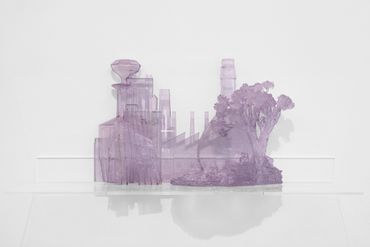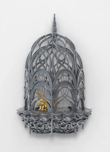 Beyond a condemnation of the notion of human progress, the medium itself represents a spectral analysis of the vicissitudes of historical labor production and the fantasy of a workfree society. Designed in 3D modeling software and manufactured in a variety of industrial materials from brass to new-age plastics, Goffman’s lilliputian compositions often showcase fictional societies in various states of work, leisure, and governance. Despite the evident use of a new means of technological production, it’s not immediately obvious what period of time Goffman’s work belongs to, and it’s similarly unclear the impact that printing technologies will have on society outside of artmaking, adding a paradoxical sense of urgency to Goffman’s practice.