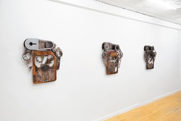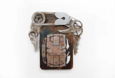 Beyond contending with contemporary issues of technoaffect, Greer’s series of sculptures depict an assemblage invested in nested representations. The sculptures feature hinges connecting separate pieces, imitating a Swiss Army knife, comprising a collapsible multi-tool that features hollowed negative spaces wherein the artist reveals these nested representations. The aggregate results of these formal qualities produce a mise en abyme in opposition to what we typically attribute to the hidden registers in the ciphering of information. From the hinges, separate parts fan out in an overlay fashion where, at times, the foreground surface is see-through, revealing emblematic imagery; logocentric references such as a camera shutter, a keyhole, ornamental patterns, component drive inserts, and other cut-outs. Greer complicates the revelatory quality of the aggregate layering by introducing hinges that are unnecessary for the object’s conventional multi-tool functionality. As the hardware serves as a further affirmation of animation, the chemical patination of the laser-cut steel sculptures produces the coloring often associated with relics. Both are self-reflexive parables of vibrant matter, its withering and entropic shift in the passing of time.