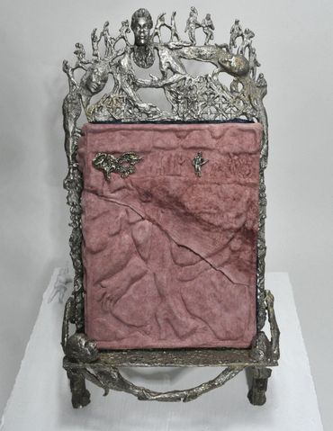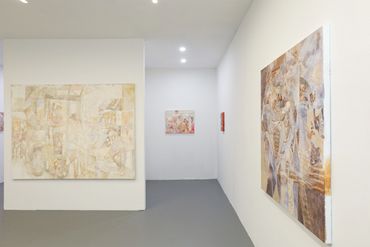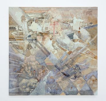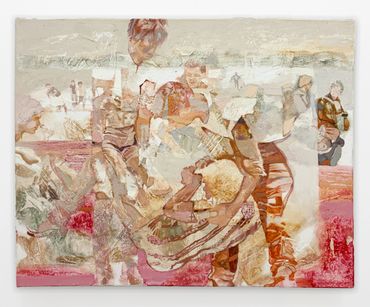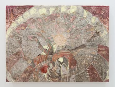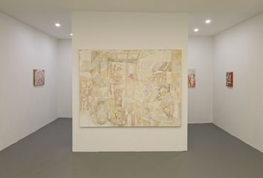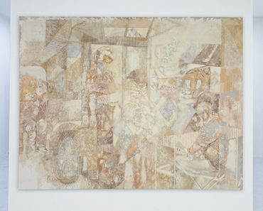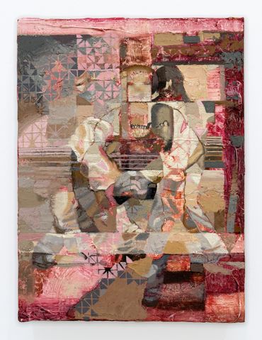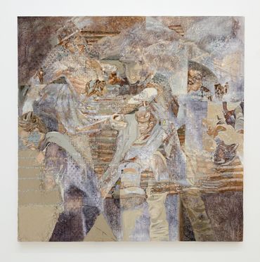 While the astounding detail of Kellum’s canvases contain a seemingly infinite amount of amusing references, the inimitable magnitude of her paintings resists any interpretation of her practice as purely humorous or political. In order to achieve this textural complexity, each canvas is underlaid with a distinguishing gesso treatment made from hand-carved linoleum stamps; in one case replicating a 14th Century embroidery titled the Adoration of the Magi Altarcloth. Kellum’s intent remains unclear in replacing the ancient saints represented in the medieval tapestry, but her technique memorializes the spectral iconoclasts that populate her new visual universe.