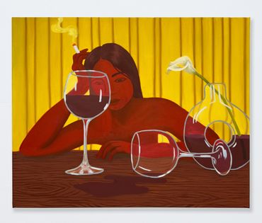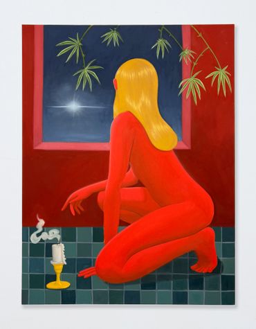 Melody Tuttle often creates scenes with an underlying geometric arrangement paired with a calculated use of representational elements, and a precise but elegant gesture. Pairing sometimes suggestive poses with indicators of malaise, introspection, and domesticity, Tuttle’s signature illuminated figures often recall contemporary painting icons like Alex Katz, Maria Lassnig, or Pieter Doig with a subtle negotiation between minimal and detailed effects that distinguishes her own visual strategy. Beyond her amalgam of art-historical and cultural influence and the sleek compositional ease that pervades each of her canvases, the undeniable appeal of Tuttle’s work derives from an approach that is both effortlessly stylish and deeply considered.