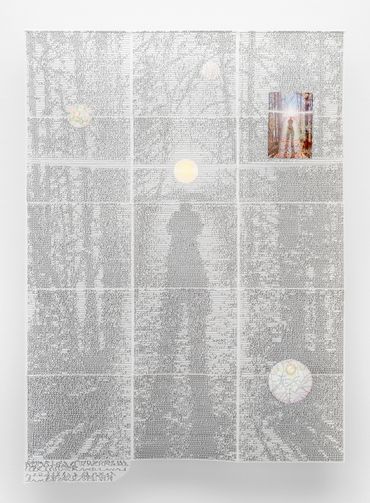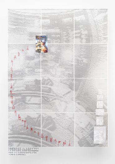 The exhibition is anchored by four suspended prints fabricated by Patrick’s bespoke printing mechanism fashioned from re-assembled 3D-printer parts and generated into square plastic sheeting in a process similar to many types of mainstream consumer production. Patrick hand sews the original digitally printed source-imagery into the composition that have been re-imagined in the artist’s calculated visual language. The content of each work draws from the perspective of the artist’s daily life, but each calligraphic symbol is coded with an indicator of a representational light-value allowing the picture to regenerate through Partick’s asemic glyphic system.