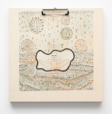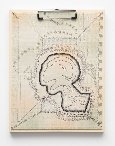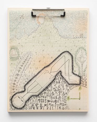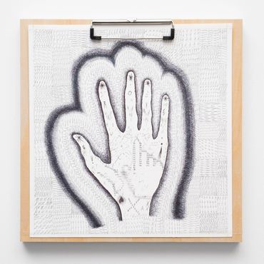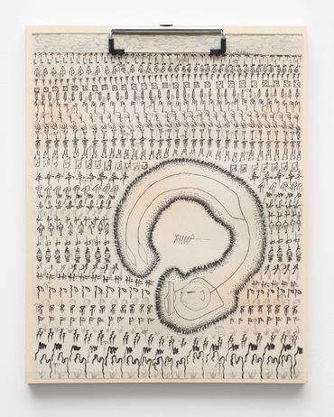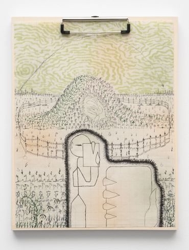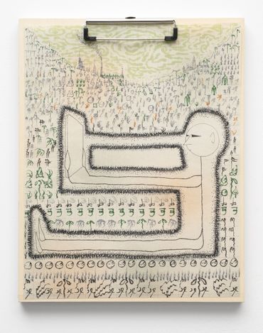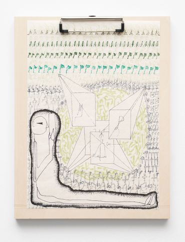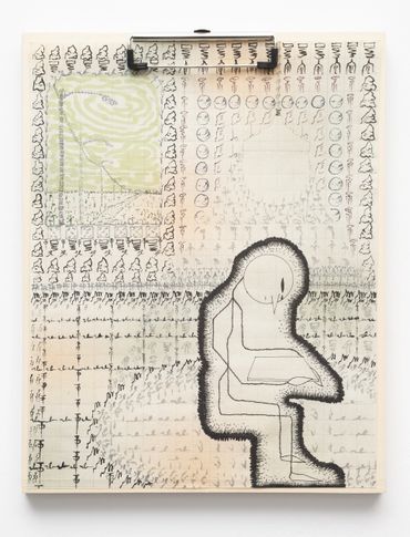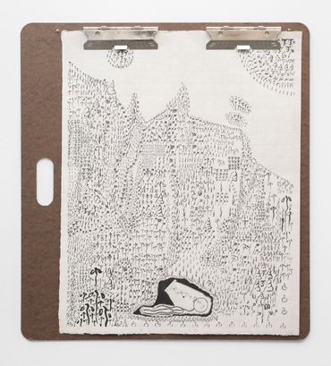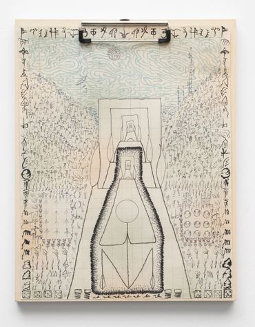 To describe Mitch Patrick’s artistic practice as mediated by technology fails to encapsulate the gravity with which digital interfacing has radically transformed our understanding of internal and external life. Depending on the viewer’s exposure to new printing and coding methods, Patrick’s multimedia approach might range in familiarity as it relates to conventional artistic applications, potentially confusing the prototypical relationship between human creativity and machine-learning production. Inspired by observations of organic shapes, Patrick creates unique symbols or glyphs equally reminiscent of ancient visual languages and contemporary digital codes, incorporated initially into hand-made drawings depicting emaciated humanoid figures amidst mysterious and atemporal landscapes. Encapsulated away from a teeming world outside, the figures are intently focused on an object suggesting the shape of a screen, a tablet, or even a window. The drawings, primarily “written” out in the artist’s conceived typographic glyphs allude to pixels, and the utterances of the artist’s hand at work, where the action of visual consumption is accounted for in each stroke of a calligraphic mark. The title of the exhibition Etiolated Calligrapher similarly references the tendency of plants and other biological entities to gravitate towards light sources, a wry analogy for the vast amount of contemporary experience envisioned through an electronic display. Each drawing is mounted on wooden clipboards reminiscent of clerical work further confounding the outmoded historical distinction between poetic visual mark-making and the presumed sterile monotony of digital coding or technocratic office culture.